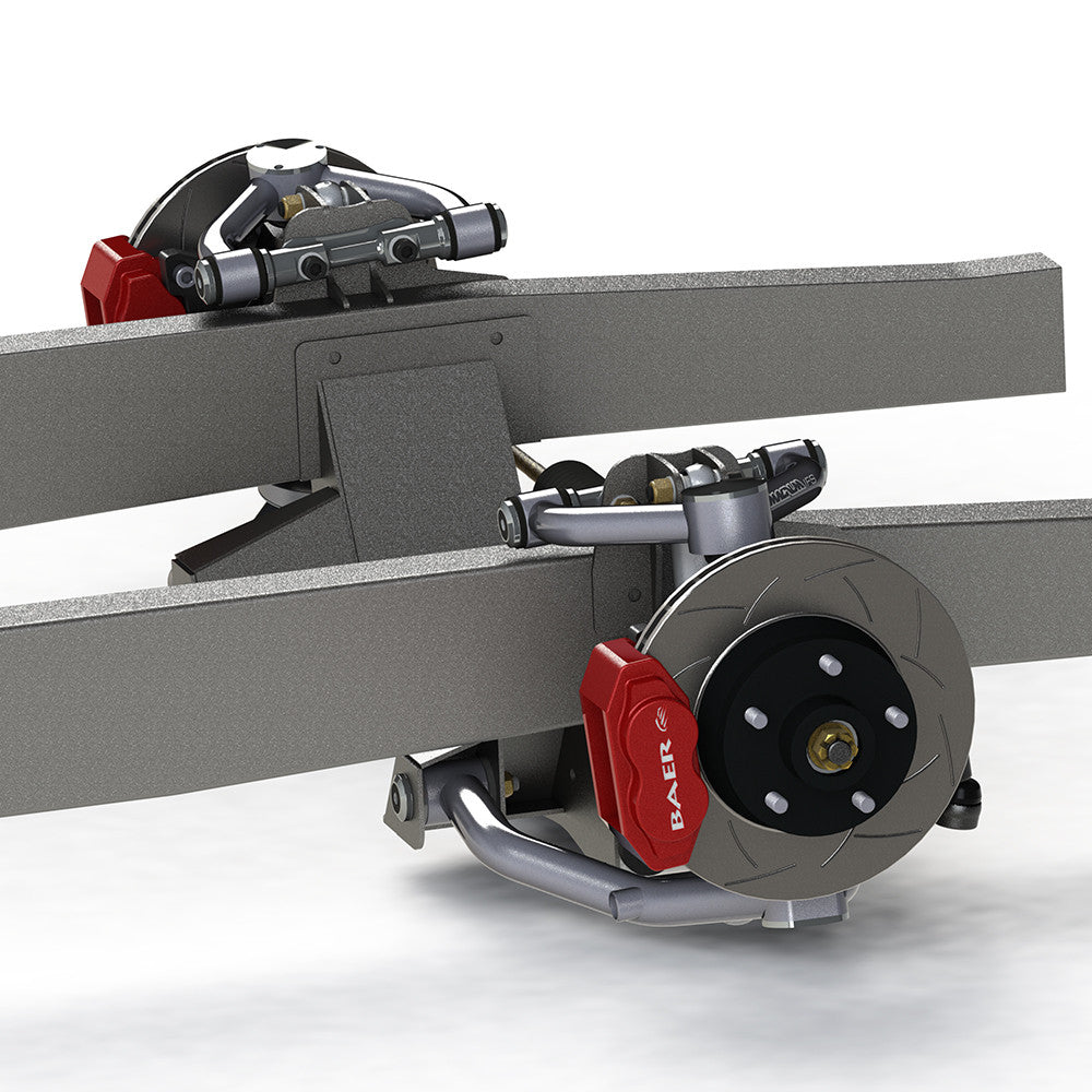 The standard unit ships complete with BAER S4 brake calipers, Ridetech Shockwaves, power steering rack, brake pads, integrated anti-roll bar, polyurethane bushes and all required fasteners. No hidden extras to be paid for, though there are many options for bigger brakes, custom colours etc. if required. (Control arms are powder coated satin black as standard, and the crossmember is left raw as this is a weld in unit).